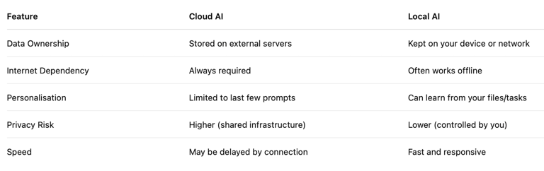 Many cloud-based AI tools process and store your data. Even when anonymised, that information can be analysed, retained, or even used to improve public models.